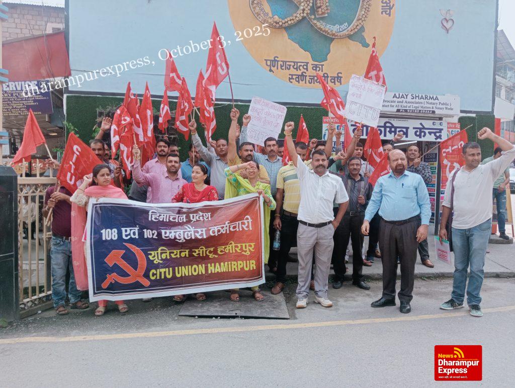 हिमाचल प्रदेश 108 व 102 कर्मचारी यूनियन ( संबंधित सीटू) ने अपनी मांगों को लेकर हड़ताल की और हमीरपुर शहर में रैली निकाली। डीसी हमीरपुर के माध्यम से मुख्यमंत्री को मांगों का ज्ञापन सौंपा l पिछली रात 8 बजे से ही ये कर्मचारी एक दिन की हड़ताल पर हैं l सुबह से ही एंबुलेंस कर्मचारी अस्पताल के बाहर इकट्ठा हुए और अपनी मांगों को लेकर नारेबाजी की और अस्पताल से लेकर सचिवालय तक रैली निकाली l इस रैली को सीटू के राष्ट्रीय सचिव डॉ कश्मीर सिंह ठाकुर, जिला सचिव जोगिंदर कुमार ने संबोधित किया।